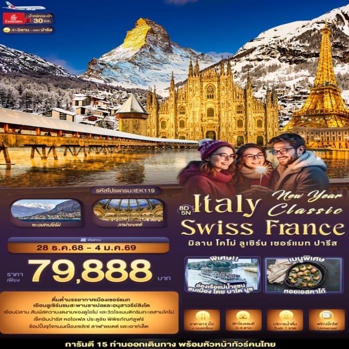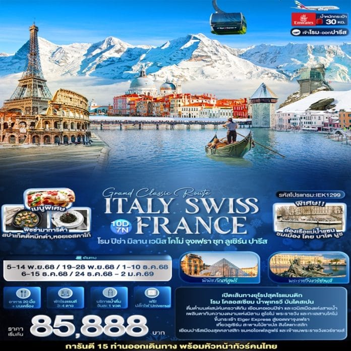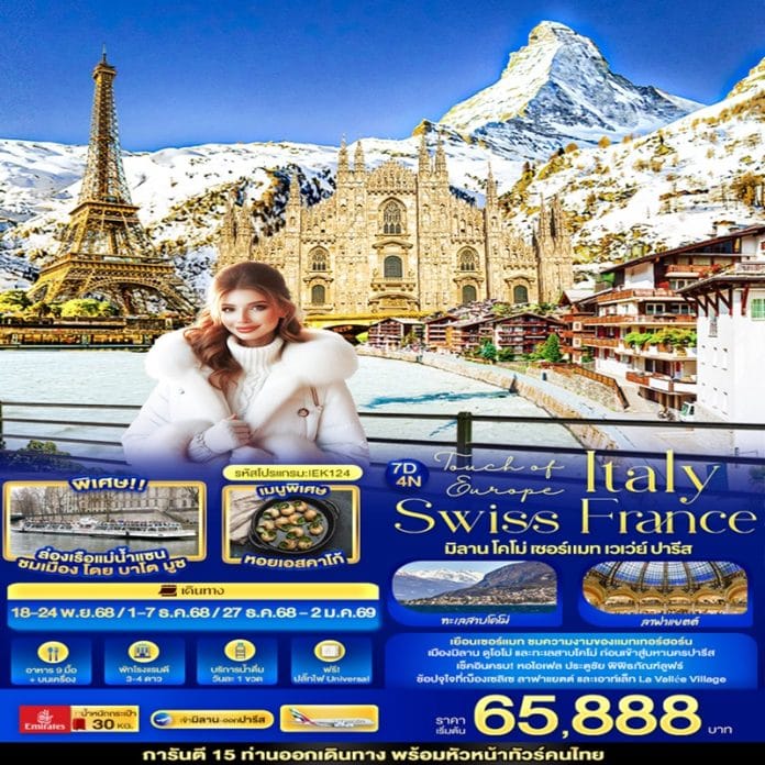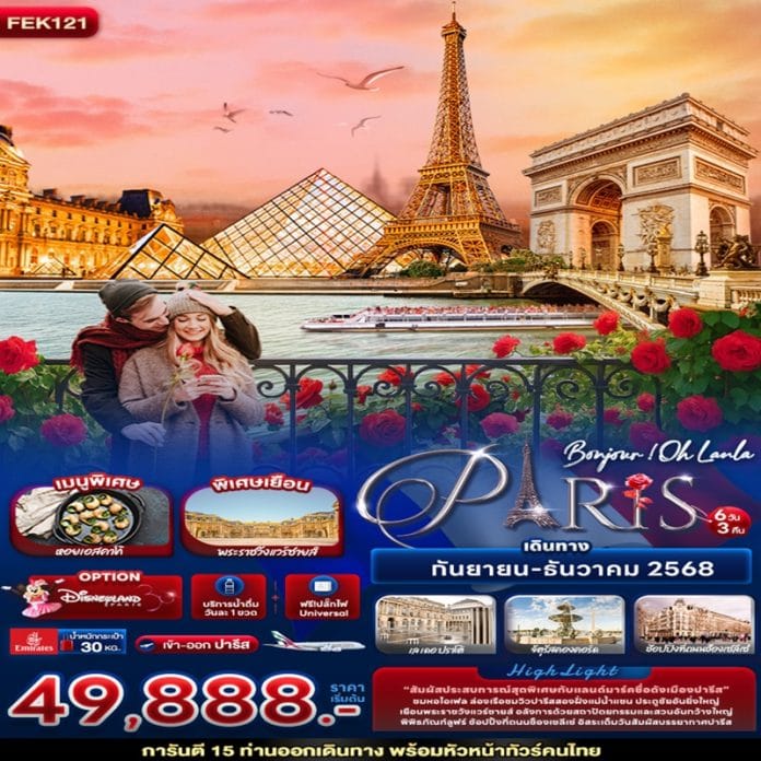 | วันที่ 6 | เมืองปารีส – ประตูชัยฝรั่งเศส – ถนนฌ็องเซลิเซ่ – ผ่านชมจัตุรัสคองคอร์ด – หอไอเฟล – ล่องเรือแม่น้ำแซน โดย บาโต มูช (รวมล่องเรือ) |
