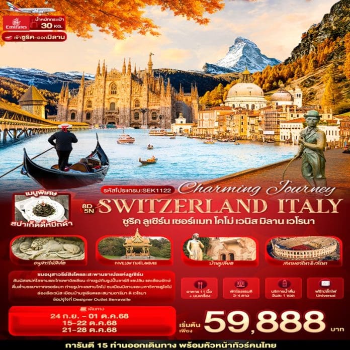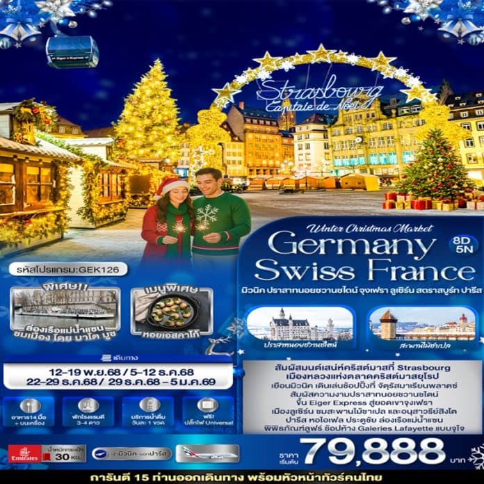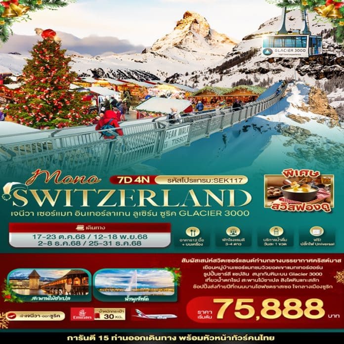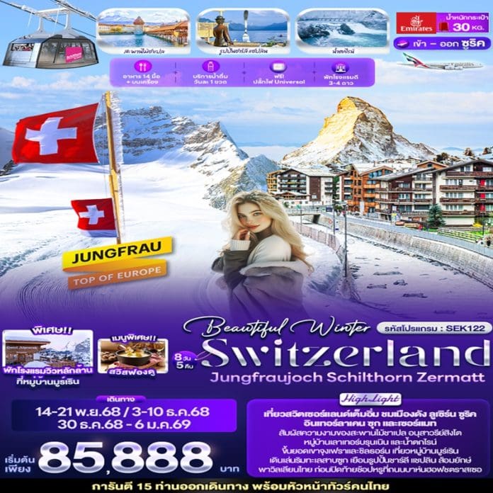 | วันที่ 4 | เมืองลูเซิร์น – สิงโตหินแกะสลัก – สะพานไม้ชาเปล – สถานีกรินเดลวัลด์ – ขึ้นกระเช้าไอเกอร์ เอ็กเพรส สู่ สถานีไอเกอร์เกลตเชอร์ – ต่อรถไฟ สู่ สถานีรถไฟจุงเฟรายอร์ค – ปราสาทน้ำแข็ง – อัลไพน์ เซนเซชัน – สฟิงซ์ฮอลล์ – รถไฟไต่เขาลงจากยอดเขาจุงเฟรา – ลงกระเช้าไอเกอร์ เอ็กเพรส สู่ สถานีกรินเดลวัลด์ – เมืองสตราสบูร์ก |