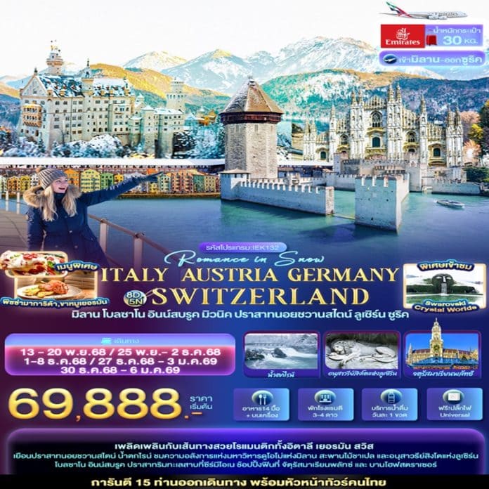 | วันที่ 2 | EK385 BKK-DXB 01.35 – 04.45 ท่าอากาศยานนานาชาติสุวรรณภูมิ – ท่าอากาศยานนานาชาติดูไบ แวะพักเปลี่ยนเครื่อง EK049 DXB-MUC 08.50 – 13.15 ท่าอากาศยานนานาชาติมิวนิค ประเทศเยอรมนี – เมืองมิวนิค – จัตุรัสมาเรียนพลัทซ์ – ศาลาว่าการใหม่ – ศาลาว่าการเก่า |