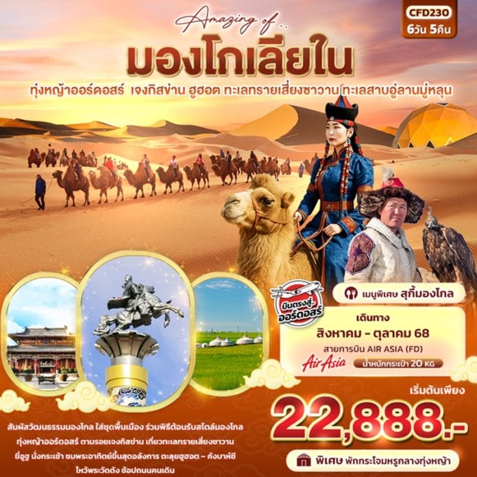 | วันที่ 5 | ชมพระอาทิตย์ขึ้นที่ทุ่งหญ้า – ชิมอาหารเช้าแบบมองโกล – ร้านขนอูฐ – แหล่งวัฒนธรรมมองโกลหยวนหลิว – วัดพระโพธิ์สัตว์อุลาน – ถนนคนเดินคังบาชี – สนามบินนานาชาติออร์โดส เอจิน โฮโร – ท่าอากาศยานนานาชาติดอนเมือง FD781 DSN-DMK 22.50-02.50(+1) |