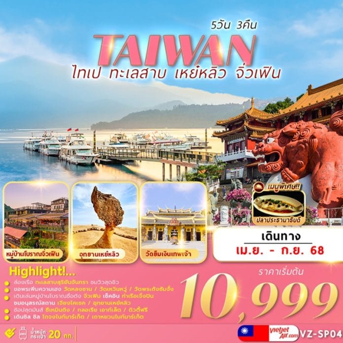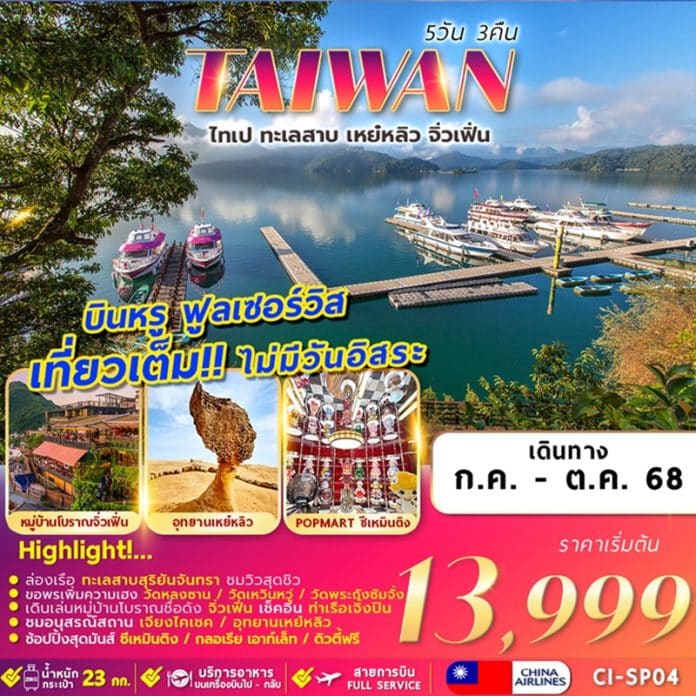 | วันที่ 2 | สนามบินนานาชาติเถาหยวน CI838 (02.40-07.25) – เมืองหนานโถว – ล่องเรือทะเลสาบสุริยันจันทรา (รวมค่าล่องเรือ) – วัดพระถังซัมจั๋ง – วัดเหวินหวู่ – แวะชิมชาอู่หลง – เมืองไถจง – ไถจงไนท์มาร์เก็ต STAY HOTEL หรือเทียบเท่า |