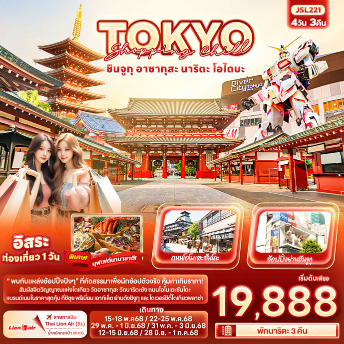 ทัวร์ญี่ปุ่นอิสระ พบกับแหล่งช้อปปิ้งปังๆ ทัวร์ญี่ปุ่นอิสระ 1 วัน ที่คัดสรรมาเพื่อนักช้อปตัวจริง คุ้มค่าเกินราคา! สัมผัสจิตวิญญาณแห่งโตเกียว วัดอาซากุสะ วัดนาริตะซัง ถนนโอโมเตะซันโดะ ทัวร์ญี่ปุ่นfreeday แบรนด์เนมในราคาสุดคุ้ม ที่ชิซุย พรีเมี่ยม เอาท์เล็ต ย่านดังชิจูกุ และ ไดเวอร์ซิตี้โตเกียวพลาซ่า JSL221 Shopping Chill TOKYO
